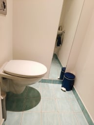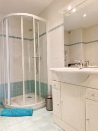 - A functional bathroom with a spacious shower cubicle, washbasin with storage unit underneath, towel rail, hairdryer, washer-dryer and a separate toilet.