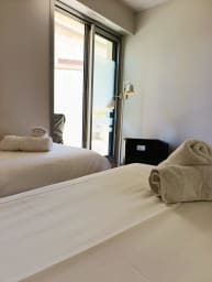 - A bright bedroom with: Two single beds, a night light, a bedside table and access to the balcony.